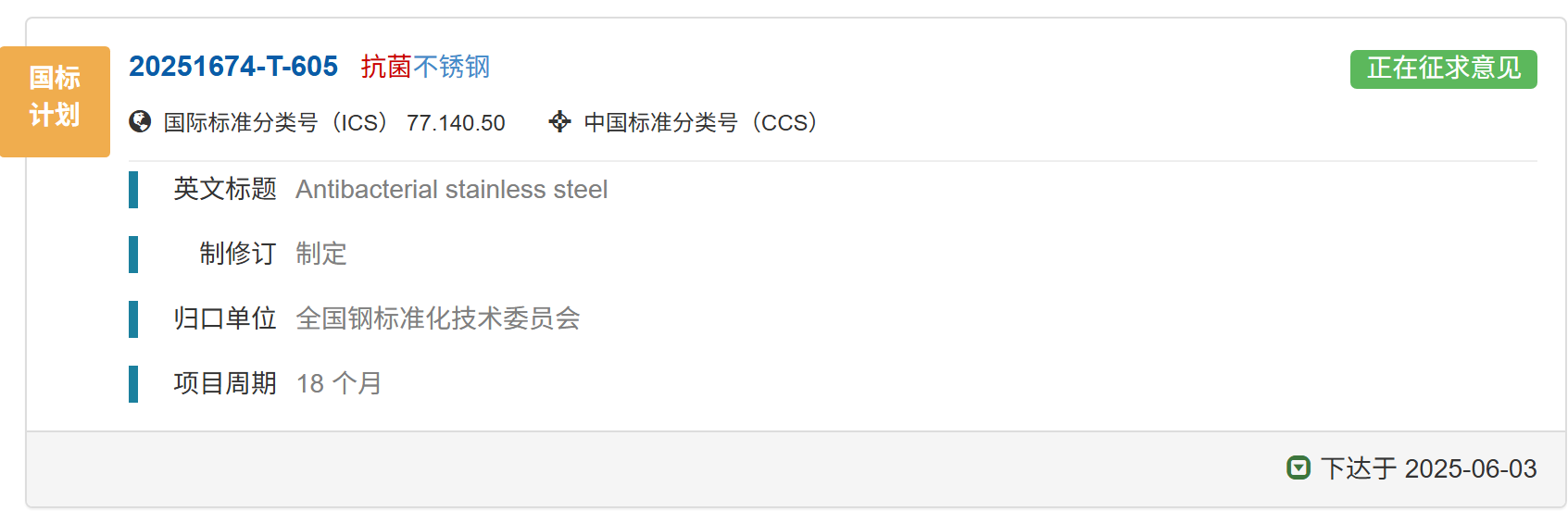 國家標(biāo)準(zhǔn)《抗菌不銹鋼》正在征求意見中,歡迎報名成為參編單位并提出修改意見和建議。01 國家標(biāo)準(zhǔn)計劃《抗菌不銹鋼》已下達(dá)國家標(biāo)準(zhǔn)計劃《
